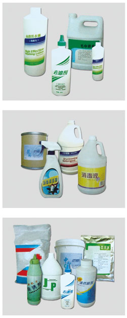 | 通用洗衣粉 強(qiáng)力洗衣粉 強(qiáng)力增自洗衣粉 濃縮洗衣粉 強(qiáng)力臺(tái)布粉 柔軟毛巾粉 彩漂粉 低溫彩漂粉 超強(qiáng)乳化劑 超強(qiáng)乳化劑(非離于型) 增白脫灰洗衣粉 漂粉/氯漂粉 柔順劑(粉) 強(qiáng)力合成堿 中和酸劑 軟水劑 去漬酸粉 漿粉 衣領(lǐng)凈 絲毛洗滌劑 羽絨服清洗劑 除銹劑 去油去污增白膏 高效洗衣露 毛巾清香劑 強(qiáng)力醫(yī)用洗衣粉 去血漬洗衣粉 消毒液 消毒液(II型) | Universal detergent Strong detergent Whitening strong detergent Concentrated liquid Strong table-doth powder Soft towl powder Color bleaching powder Low-temper bleaching powder color Super Emulsifier Super emulsifier (non-ionic) Detergent for whitening and dust removing Bleaching powder/chlorine bleaching powder Softener (powder) Synthesis strong alkali Dilute acid Soft water agent Acid powder Powder slurry Collar detergent Silky detergent Down Cleaner Rust removing agent Whitening cream for oil decontamination High-efficiency detergent Towel fresh detergent Supper medical detergent Detergent for blood removal Disinfectant Disinfectant (II type) | |
