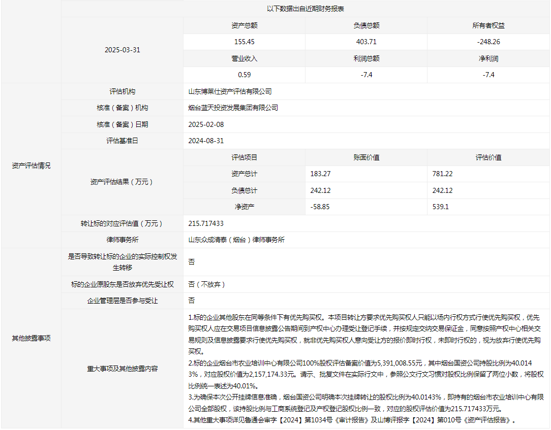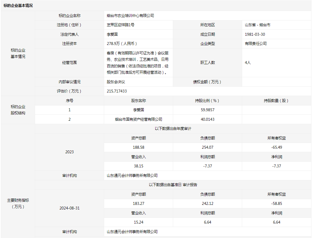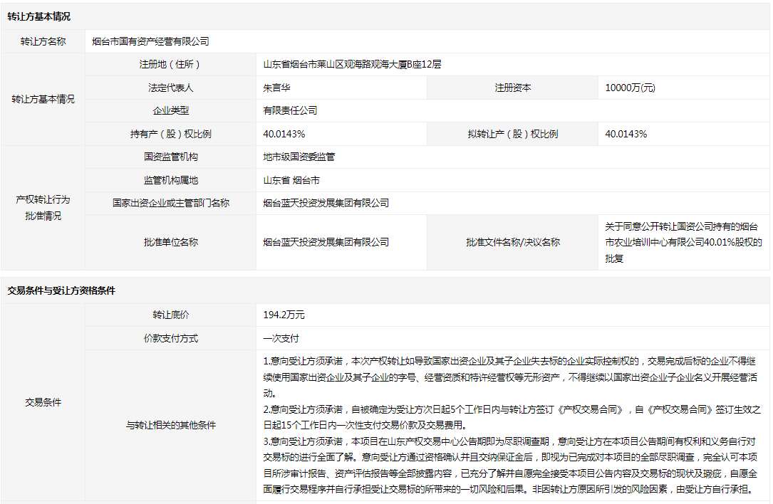 煙臺市農(nóng)業(yè)培訓中心有限公司40.0143%國有股權