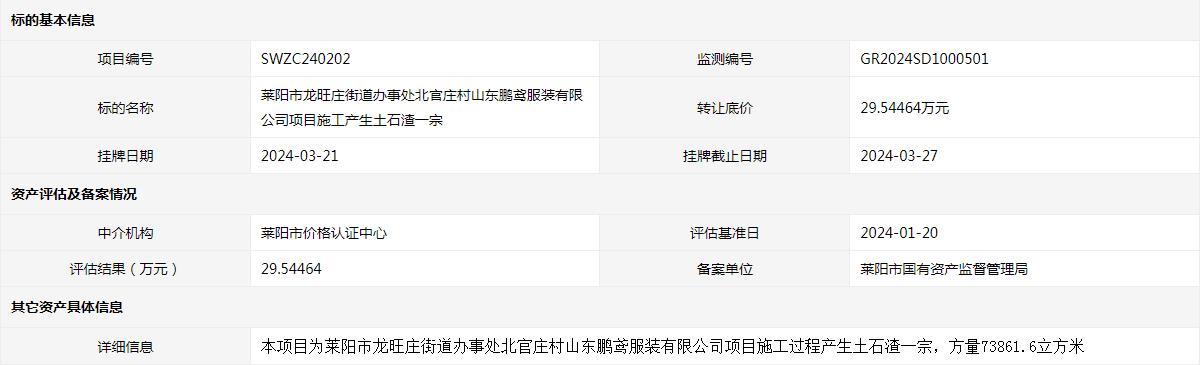 萊陽市龍旺莊街道辦事處北官莊村山東鵬鳶服裝有限公司項目施工產(chǎn)生土石渣一宗