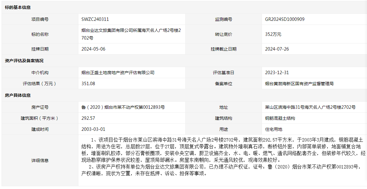 煙臺業(yè)達文旅集團有限公司所屬海天名人廣場2號樓2702號