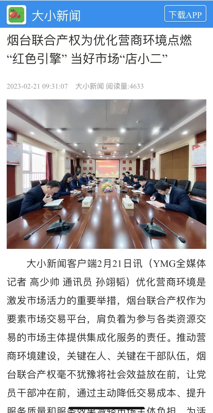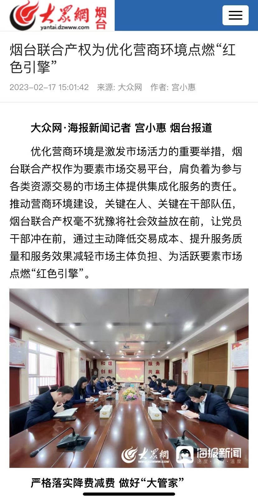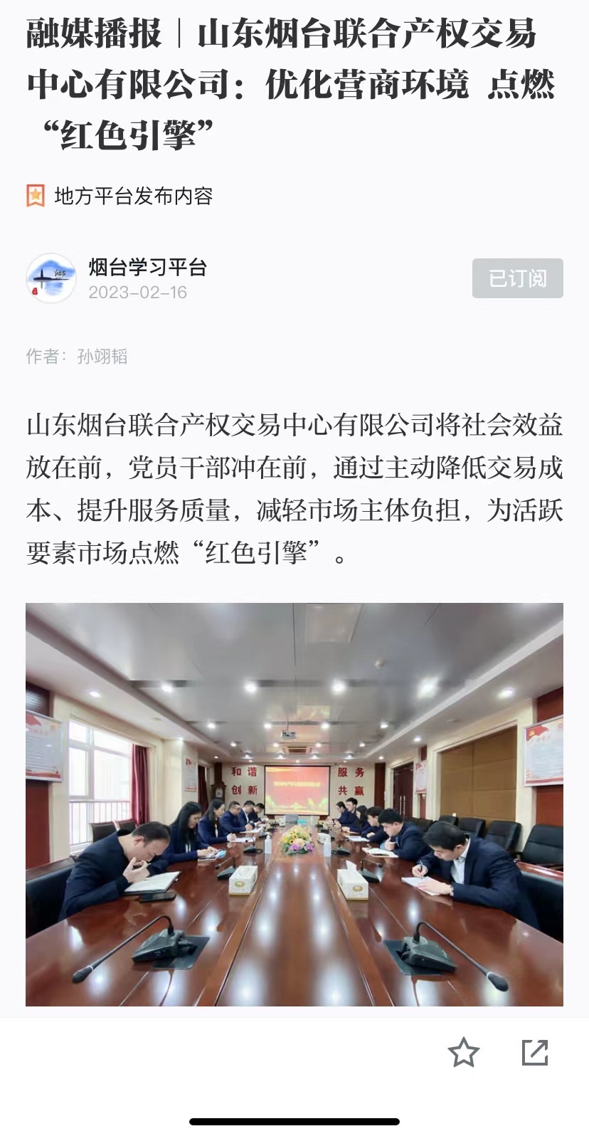 近日,“學(xué)習(xí)強國”煙臺平臺、煙臺日報社大小新聞網(wǎng)、大眾網(wǎng)煙臺刊發(fā)署名文章《煙臺聯(lián)合產(chǎn)權(quán)為優(yōu)化營商環(huán)境點燃“紅色引擎”當(dāng)好市場“店小二”》,全面介紹了2022年煙臺聯(lián)合產(chǎn)權(quán)作為要素市場交易平臺,肩負(fù)著為參與各類資源交易的市場主體提供集成化服務(wù)的責(zé)任,在推動營商環(huán)境建設(shè)方面,毫不猶豫將社會效益放在前,讓黨員干部沖在前,通過主動降低交易成本、提升服務(wù)質(zhì)量和服務(wù)效果減輕市場主體負(fù)擔(dān)、為活躍要素市場點燃“紅色引擎”。